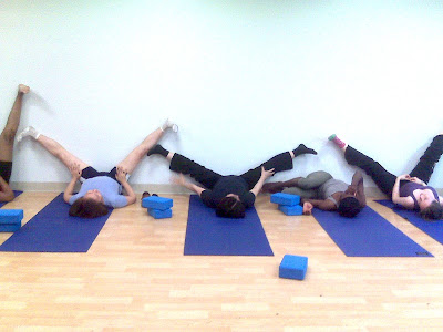 This was inspired by an article inYoga Journal: I had everyone in my class with feet splayed against the wall to practice some "gravitationally assisted" hip openings. Flex feet, pushing through heels, pressing calves against the wall, then relax. Note hips magically open a leeetle bit wider, heels inch down the wall ...